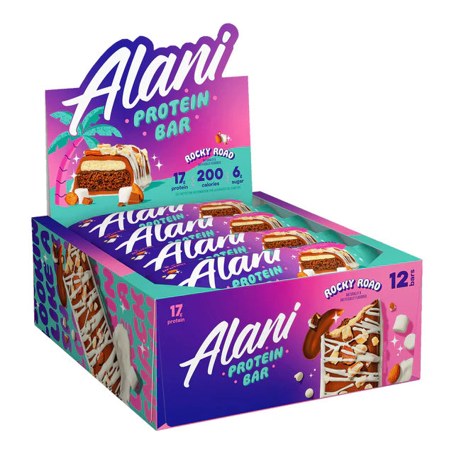 Gluten Free Rocky Road Alani Protein Bars. Topped with a chocolate coating and a delectably creamy drizzle, we sprinkle almonds, marshmallows, and 17g of protein in every bar! With just 6g of sugar and 200 calories, this chewy, gooey bar is sure to rock your world.