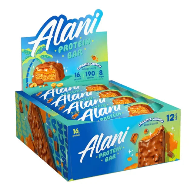 Chewy Caramel Crunch Alani Protein Bars are gluten free and packed with 16g of protein, 190 calories and 8g of sugar. Made with a gooey, melt-in-your-mouth caramel center, we top each treat with salty peanuts and sweet chocolate.