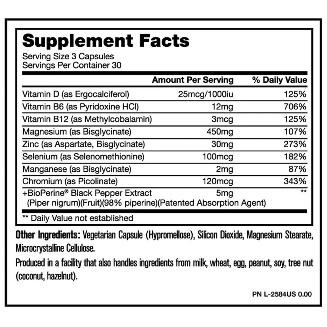 - 100% or more of your daily requirements for vitamins D, B6, B12, magnesium, zinc, selenium, and chromium