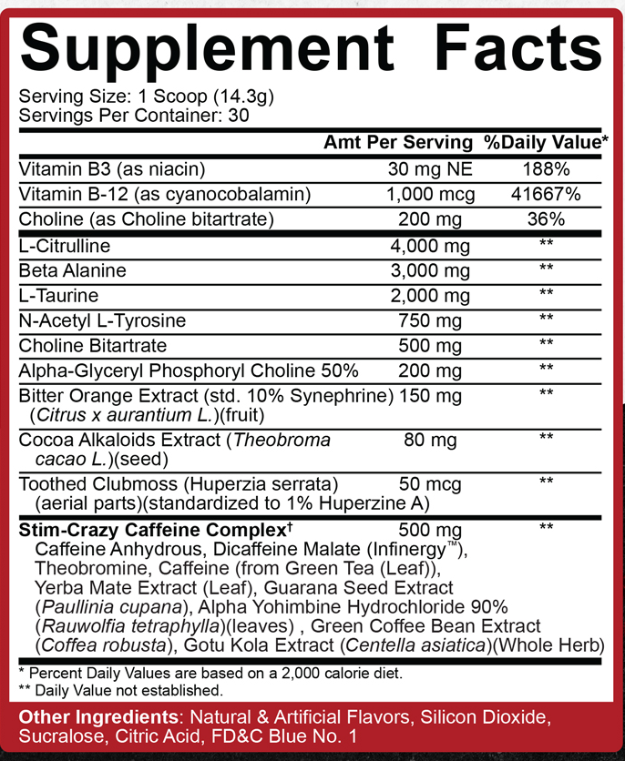 - JITTER-FREE INTENSITY & DRIVE: The Stim-Crazy Caffeine Complex delivers 400 mg of caffeine derived from 7 sources, including time-released Dicaffeine Malate and extracts from coffee, green tea, yerba mate, guarana, and green coffee. Destroy every session!