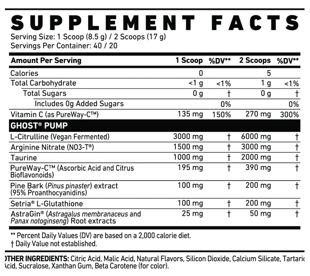 To round out the formula, GHOST® Pump includes 2g of Taurine, Pine Bark Extract (95% proanthocyanidins), and Setria® L-Glutathione, combined with PureWay-C™ (a buffered form of Vitamin C with citrus bioflavonoids) to provide additional antioxidant support and cellular defense.