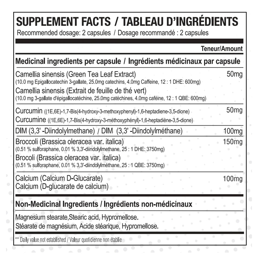 The mixture has been designed to reduce the transformation of oestrogen (E2) to bad oestrogens (E4 and E16 with sulforaphane and DIM) and to increase elimination of these bad oestrogens (calcium d-Glucarate and green tea leaf extract).
